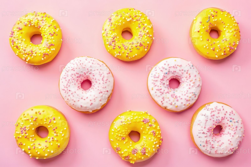 Цветные пончики с посыпаниями, расположенными на розовом фоне
