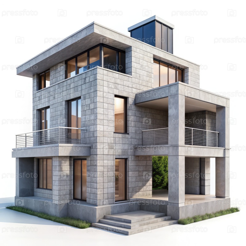 Современный дизайн бетонного дома с несколькими уровнями и большими окнами. генеративная ИИ
