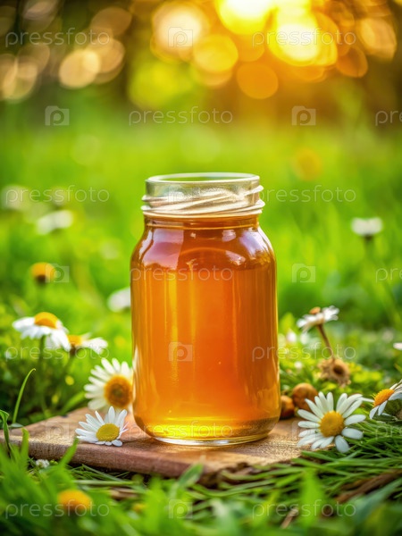 Стеклянный банка с медом, окруженная цветами на зеленой траве во время захода солнца