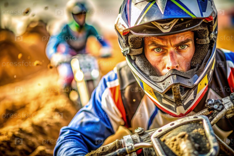 Ближайшее изображение гонщика мотокросса, сосредоточенного на трассе во время соревнований