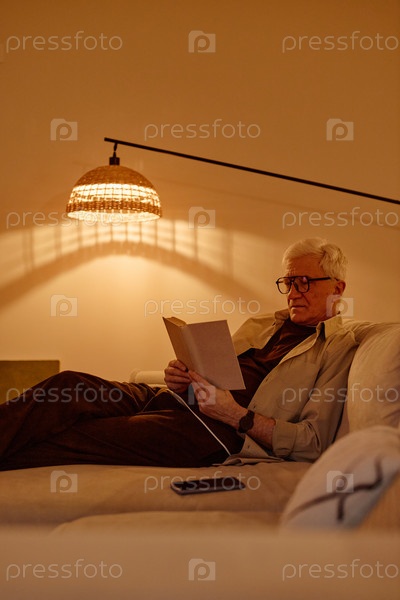 Вертикаль старшего белого мужчины, расслабляющегося на диване во время чтения книги вечером