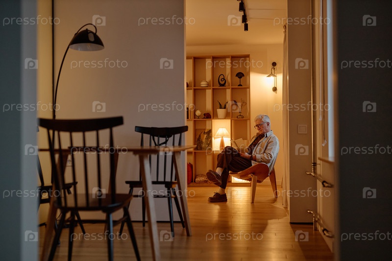 Старший белый мужчина сидит один в гостиной, читает и расслабляется