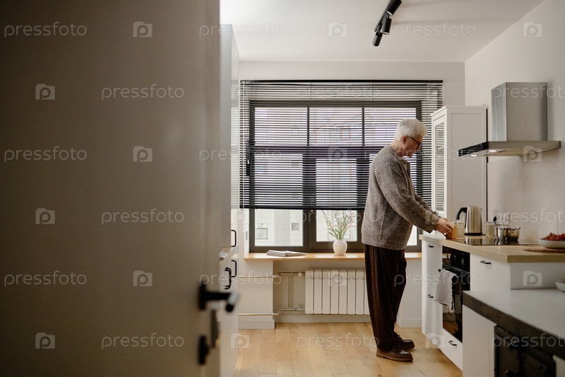 Кавказский мужчина готовит завтрак на современной кухне во время утреннего Senior
