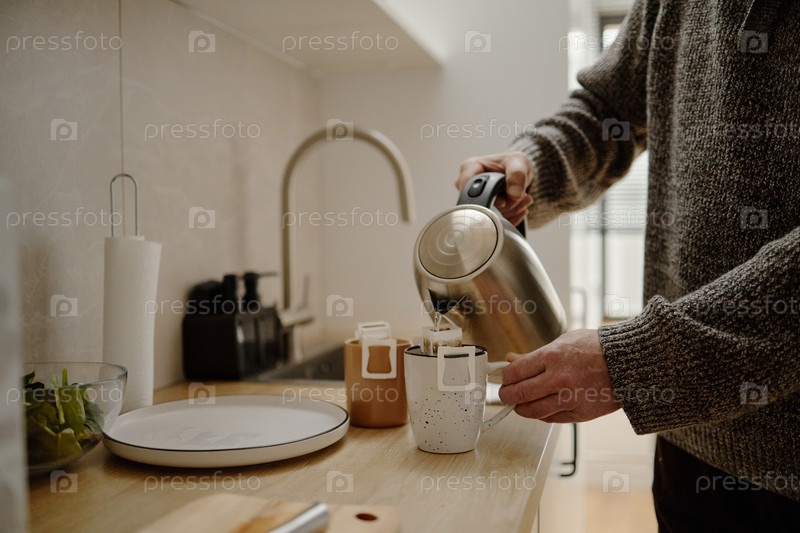 Кавказский мужчина средних лет наливает горячую воду в кружку на современной кухне