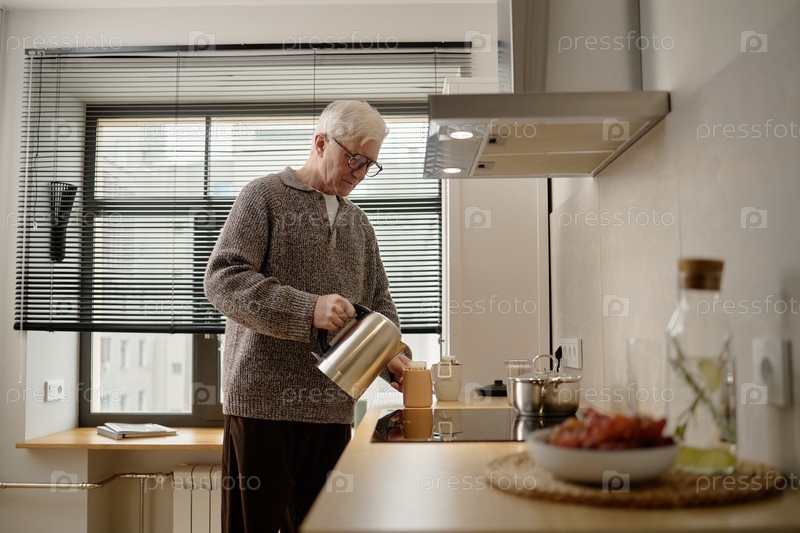 Старший белый мужчина наливает горячую воду в кружку, стоя на кухне