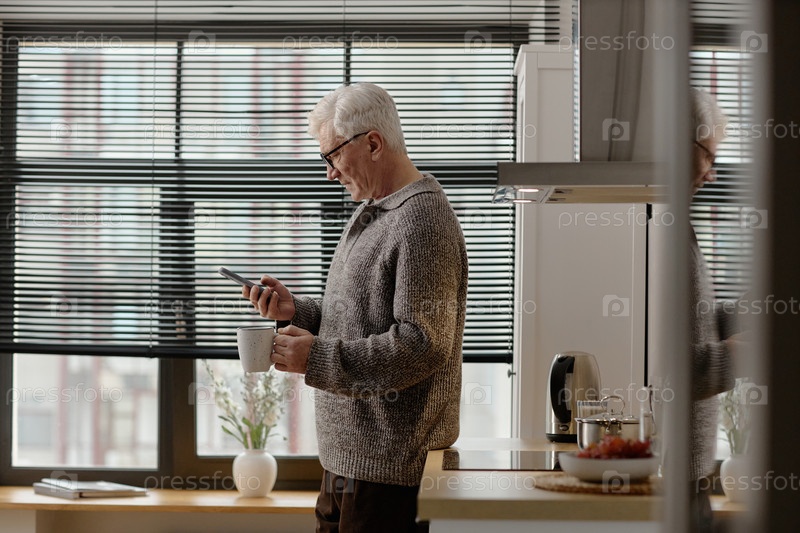Старший белый мужчина использует смартфон, выпивая кофе в помещении