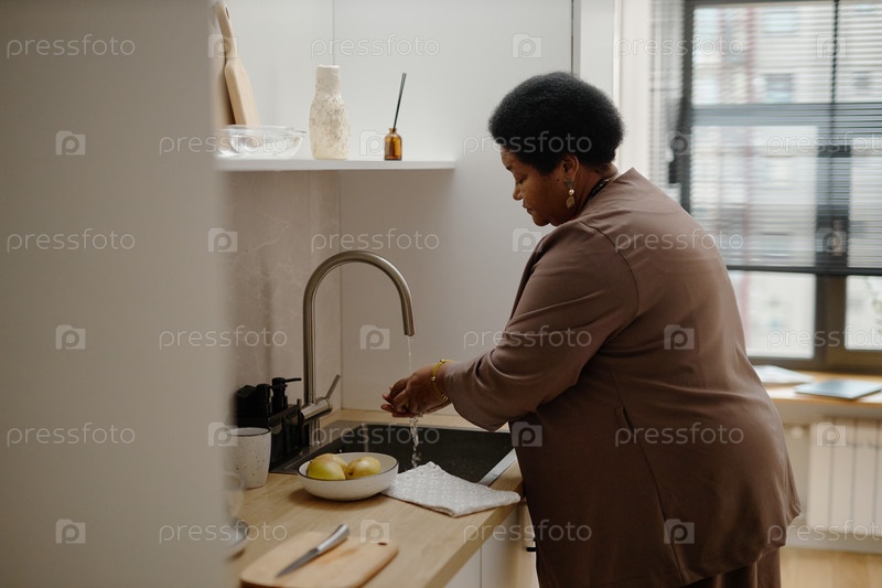Чернокожая женщина среднего возраста стирает посуду в кухонной раковине Приготовление пищи