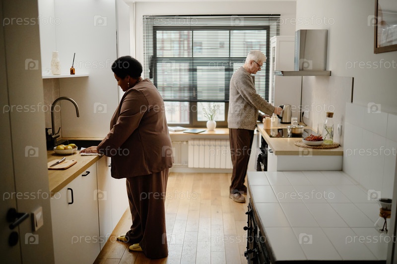 Кавказский мужчина и старшая чернокожая женщина готовят еду на современной кухне