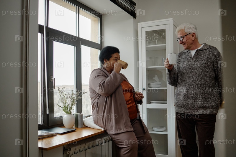 Кавказский мужчина и чернокожая женщина среднего возраста наслаждаются горячими напитками в помещении