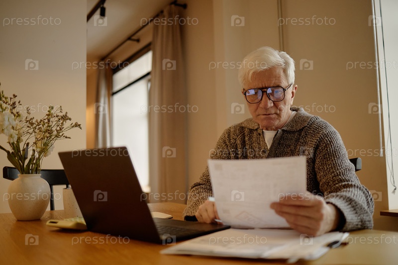 Старший кавказский мужчина просматривает финансовые документы, работая удаленно