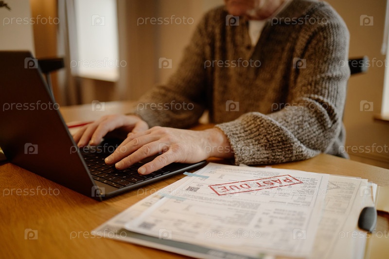 Старший кавказский мужчина использует ноутбук, рассматривая прошлые счета за коммунальные услуги