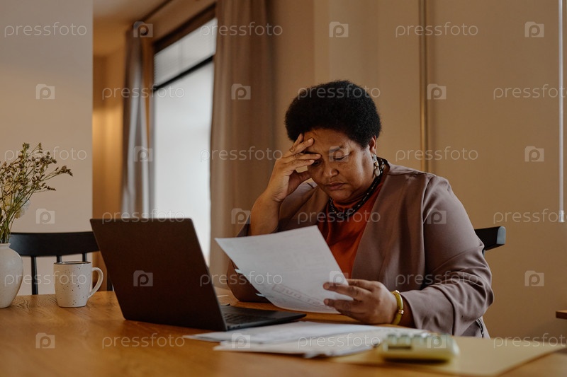 Старшая чернокожая женщина просматривает финансовые документы на рабочем столе домашнего офиса