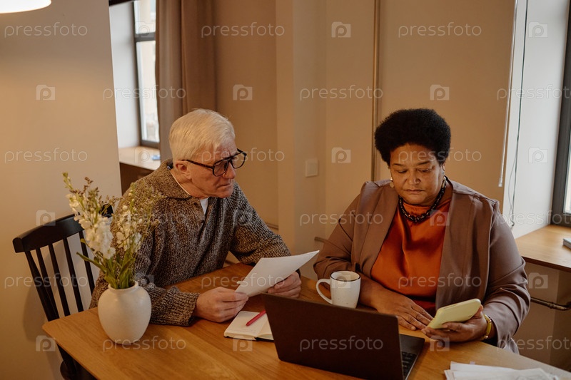 Старшая бирациальная пара просматривает бумажные коммунальные счета вместе дома