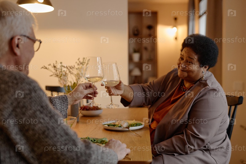 Кавказский мужчина и чернокожая женщина тостируют бокалы с вином за столом Senior Dinner Table