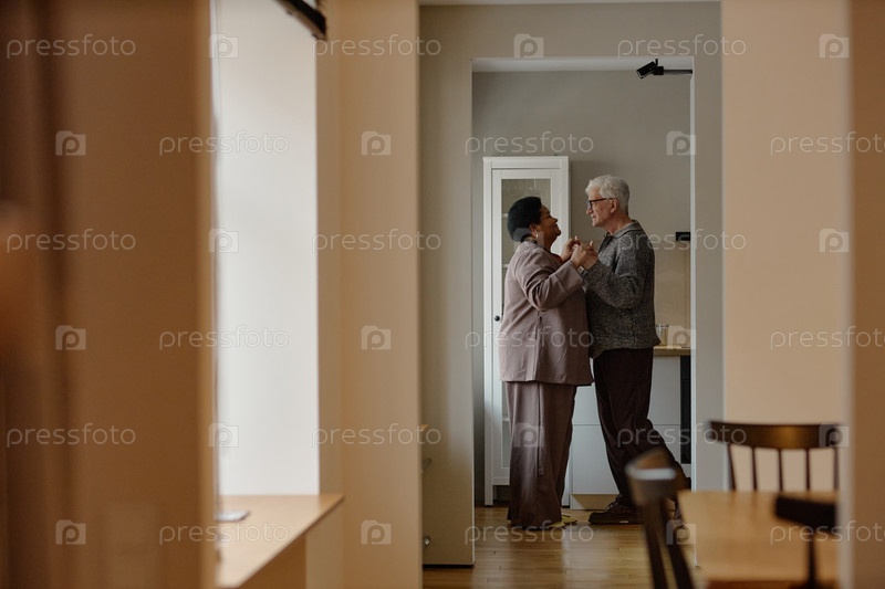 Улыбающийся старший белый мужчина и старшая чернокожая женщина танцуют вместе в помещении