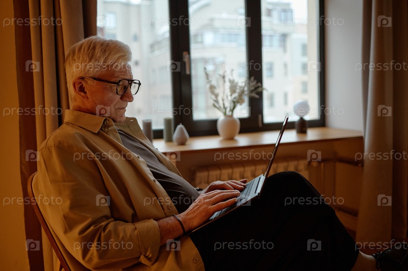Старший белый мужчина использует ноутбук, сидя в помещении возле окна
