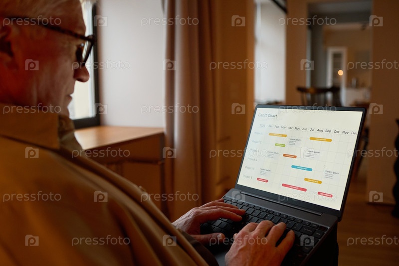 Старший белый мужчина использует ноутбук, планируя расписание дома