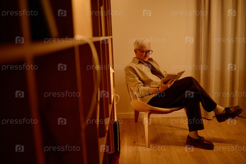 Кавказский мужчина сидит на кресле, читает старшую книгу в домашней библиотеке