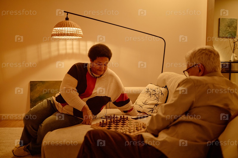 Чернокожая женщина средних лет играет в шахматы со старшим белым мужчиной внутри дома