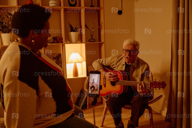 Старший белый мужчина играет на гитаре для чернокожей женщины среднего возраста дома