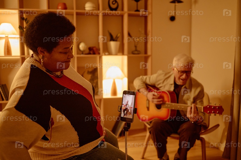Старшая чернокожая женщина записывает видео, в то время как пожилой белый мужчина играет на гитаре