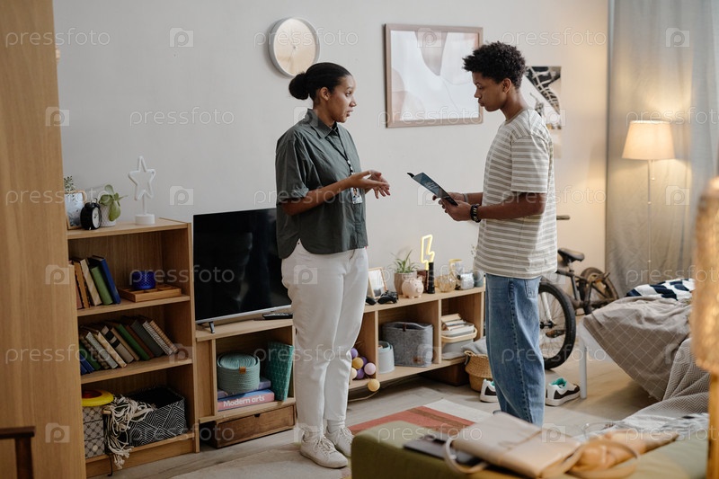 Молодой социальный работник разговаривает с подростком в помещении