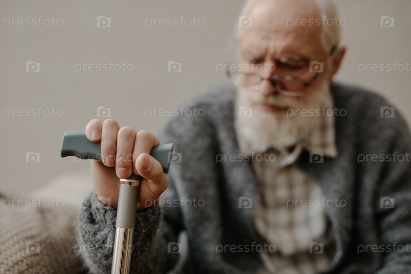 Старший кавказский мужчина держит ходовую трость, сидя в помещении