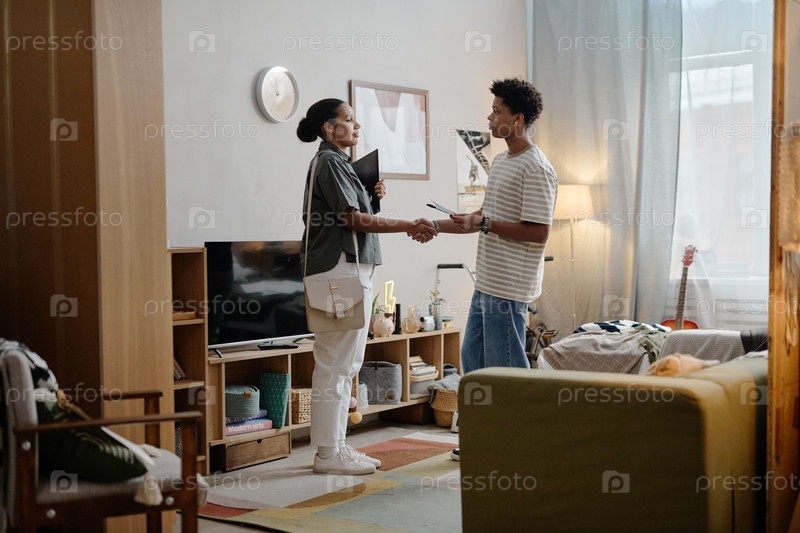Молодая чернокожая женщина социальный работник приветствует подростка во время домашнего визита