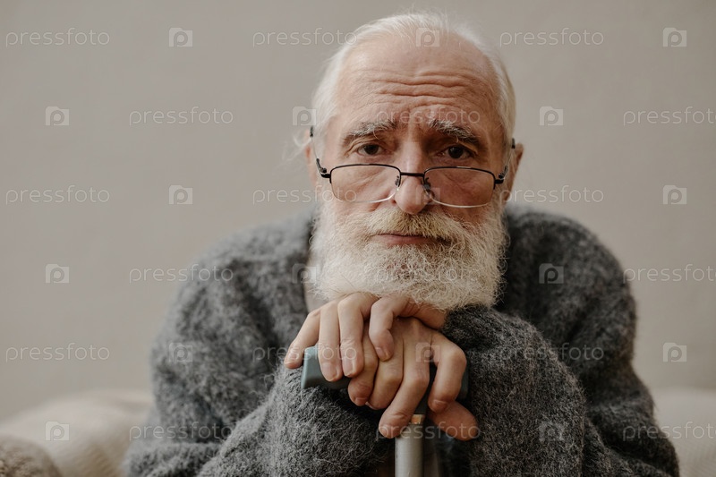 Портрет пожилого белокожего мужчины, носящего очки, отдыхающего руками на ходовой трости