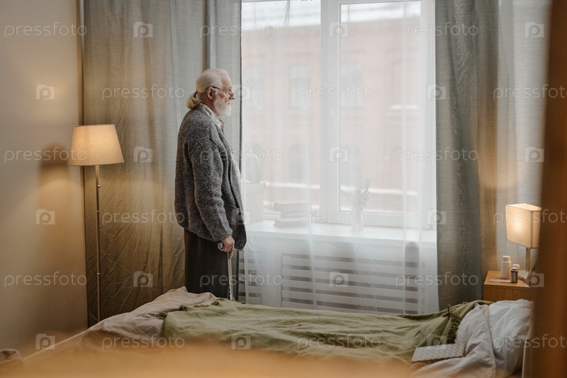 Старший белый мужчина стоит у окна, размышляя внутри в спальне