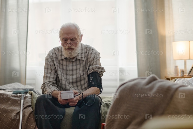 Старший кавказский мужчина измеряет кровяное давление с помощью цифрового монитора в помещении