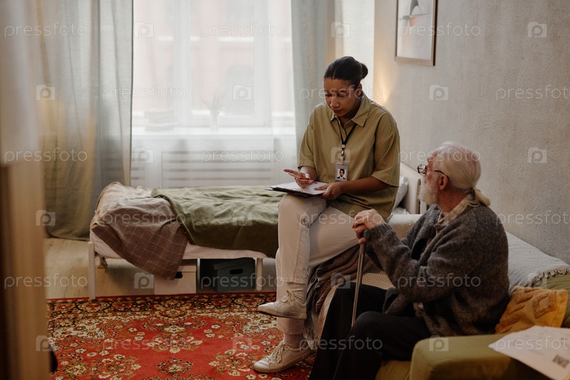 Молодая взрослая чернокожая женщина социальный работник, помогающий старшему белому мужчине в помещении