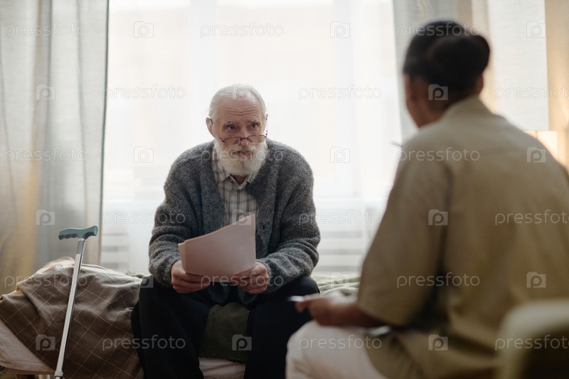 Старший белый мужчина сидит на кровати и разговаривает с женщиной-социальным работником в помещении
