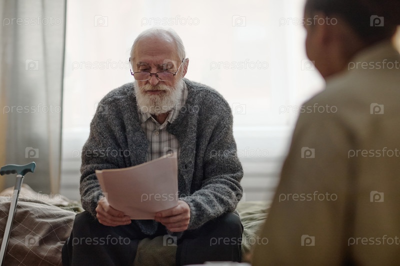 Старший кавказский мужчина читает документы с социальным работником во время домашнего визита