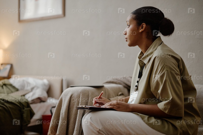 Молодая взрослая чернокожая женщина-социальный работник делает заметки во время домашнего визита