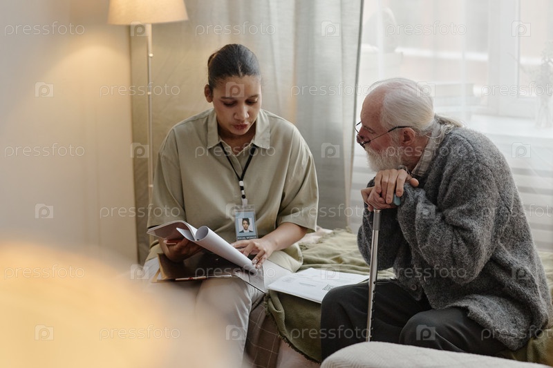 Молодая взрослая чернокожая женщина социальный работник объясняет бумажную работу старшему белому мужчине