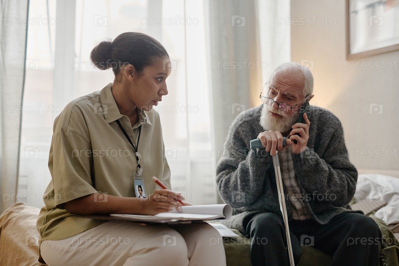 Молодая взрослая черная женщина социальный работник, помогающий старшему белому мужчине разговаривать
