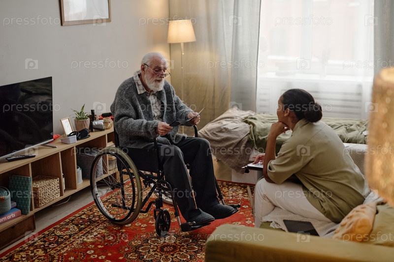 Кавказский мужчина в инвалидном кресле разговаривает с молодой чернокожей женщиной-социальным работником