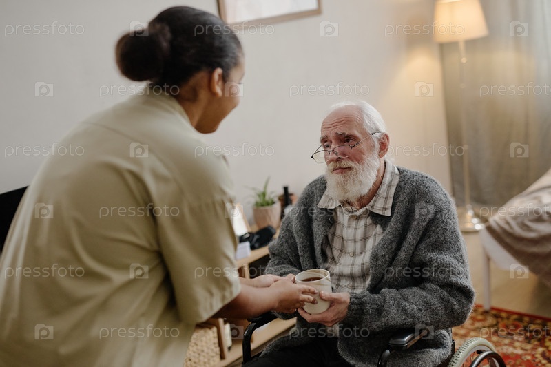 Черная женщина помогает старшему белому мужчине с инвалидностью