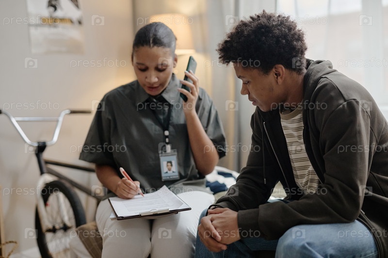 Молодая взрослая черная женщина социальный работник Консалтинг подросток клиент в помещении