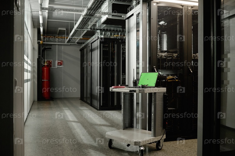 Рабочая станция с ноутбуком, стоящим в современном центре обработки данных Mobile Server Room