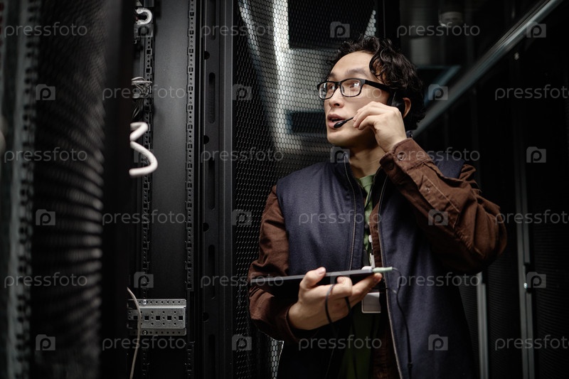 Молодой взрослый азиатский мужчина управляет обслуживанием сервера, разговаривая на наушниках