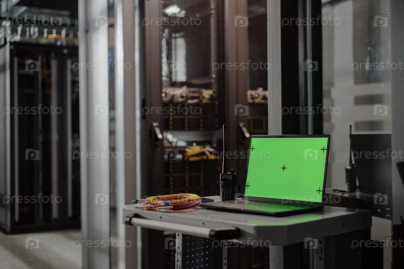 Цифровая корзина с ноутбуком с зеленым экраном, работающим в серверной установке