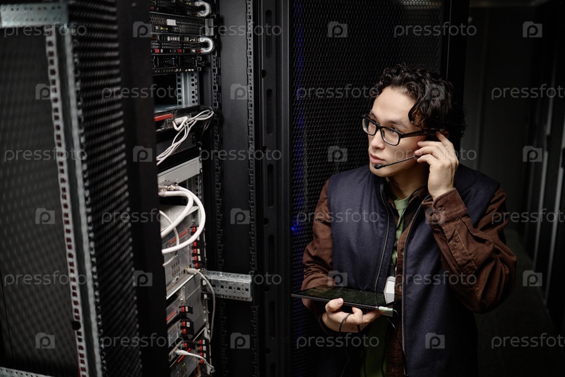 Молодой взрослый азиатский мужчина отслеживает стойку сервера при использовании цифрового планшета