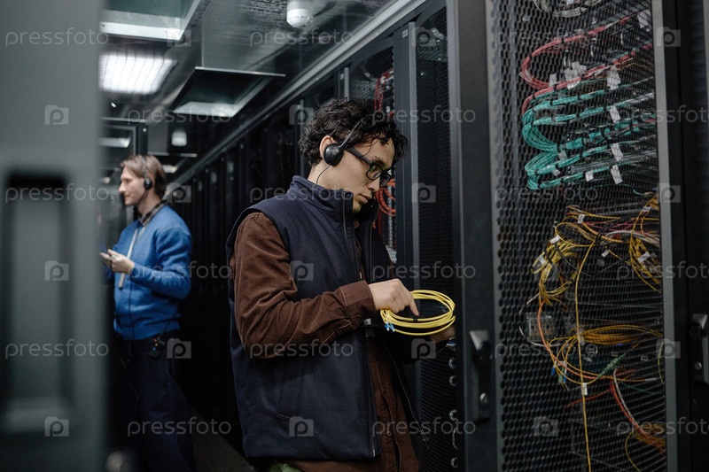 Молодой взрослый мужчина устанавливает сетевые кабели в серверной комнате
