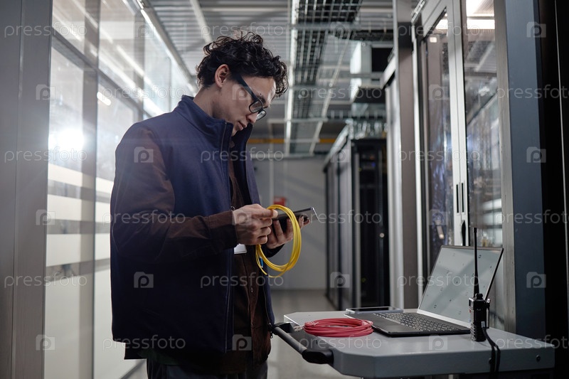 Молодой взрослый азиатский мужчина настраивает сетевые кабели в центре обработки данных