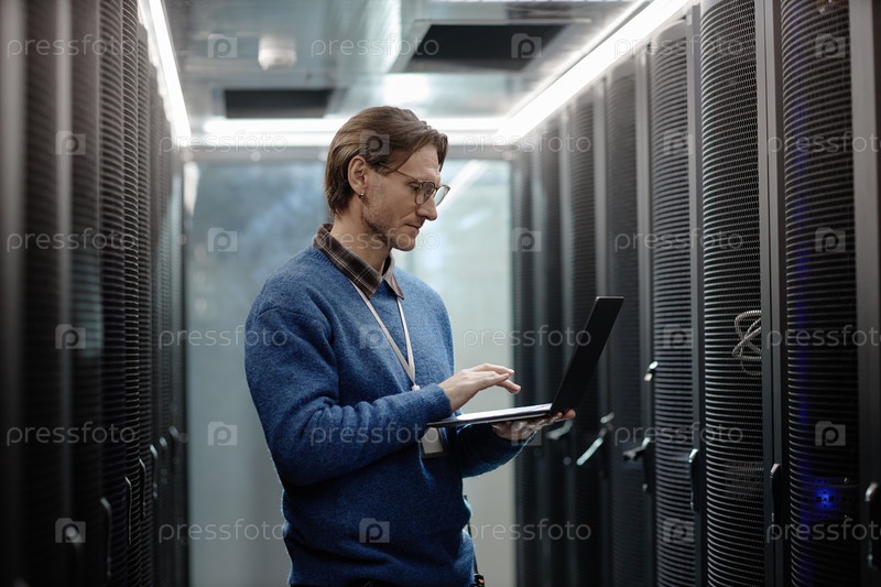 Взрослый Кавказский мужчина отслеживает центр обработки данных серверы с использованием ноутбука