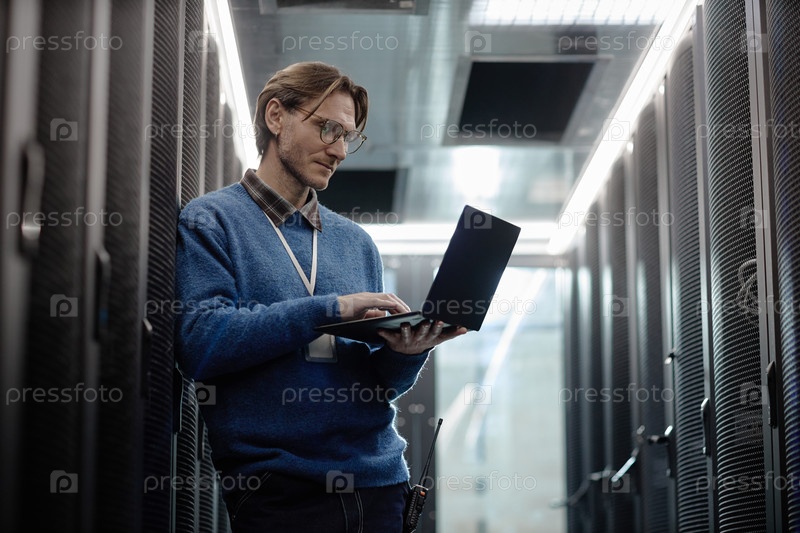 Кавказский мужчина среднего возраста, использующий ноутбук во время работы в коридоре центра обработки данных