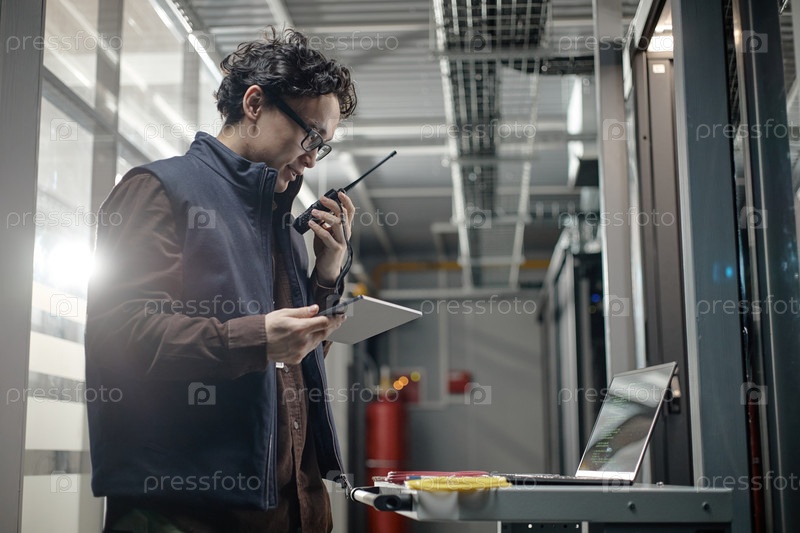 Молодой взрослый азиатский мужчина использует прослушку во время работы в серверной комнате