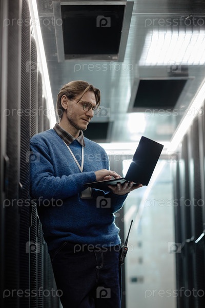 Кавказский взрослый мужчина использует ноутбук во время работы в центре обработки данных